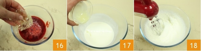 Place the drained and squeezed gelatin sheets into the lukewarm coulis 16 and stir with a teaspoon to dissolve them. In a bowl, gather the fresh liquid cream and add the condensed milk 17; whip the ingredients with beaters 18 to whip the mixture.