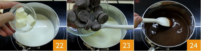 Lastly, prepare the ganache: in a saucepan, pour the cream, heat it, and when it reaches a boil, add the butter in pieces to melt it 22. Then add the dark chocolate 23 and stir with a wooden spoon to melt it 24; then pour the mixture into a bowl and cover with cling film in contact, to cool and set the ganache.