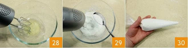 Now prepare the icing: place the egg white in a bowl with a pinch of salt, start whipping it with beaters 28 and when it's white, gradually add the powdered sugar 29, continuing to whip. Once you have a fluid and smooth mixture, place it in a piping bag with a very small tip 30.