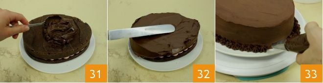 At this point, you can cover the cake with the now cooled chocolate ganache 31: spread an even layer over the entire cake using a spatula 32. Then put the leftover ganache in a piping bag with a star tip and decorate the entire perimeter of the cake with swirls 33.