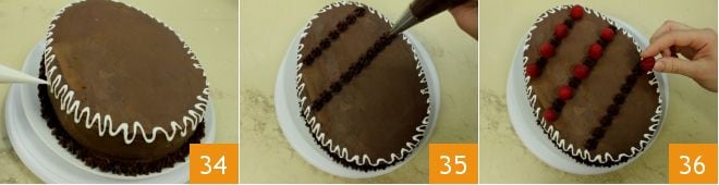 Decorate the upper perimeter with the icing 34, while the surface with ganache swirls 35 and raspberries 36. Serve your Easter egg cake as a dessert for Easter lunch!