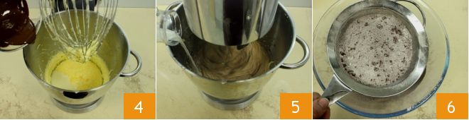 Melt the dark chocolate in a double boiler (or microwave), let it cool slightly, and pour it into the mixture 4. Continue beating and add the milk at room temperature slowly 5. In a bowl, sift the flour, baking powder, and unsweetened cocoa powder 6.