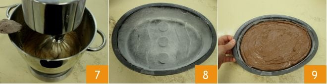 Gradually add the dry ingredients to the mixture, using a spoon 7. Butter and flour the egg-shaped mold, 11 inches long and 8 inches wide at its widest point 8, and pour the cake batter inside 9; bake it in a preheated static oven at 350°F for 60 minutes (or in a fan oven at 320°F for about 50 minutes).
