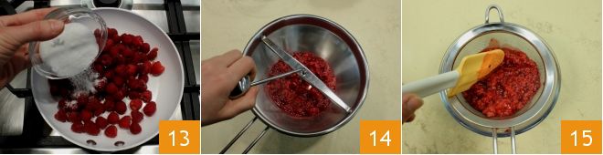 In a saucepan, add the previously washed raspberries and sugar 13: cook them over low heat, stirring until they become a puree. Pass the still warm coulis through a food mill 14, then to make it even finer, strain it with a fine mesh sieve 15.