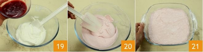 Add the coulis where you dissolved the gelatin 19, now cold, and mix with a spatula from top to bottom 20 to keep the cream from deflating. Pour the raspberry cream into a shallow, wide dish and cover with cling film in contact 21. Place it in the fridge to set until ready to use.