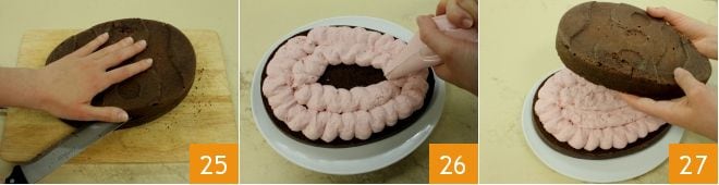 When the cake is well cooled, cut it in half horizontally to create two discs 25; place one half on a serving platter and fill it with the raspberry cream using a disposable piping bag with a very wide tip 26. Then cover with the other disc 27.
