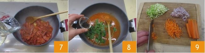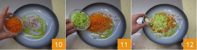 In a non-stick pan, pour the oil and add the chopped carrots 10, shallot, celery 11, and garlic 12.