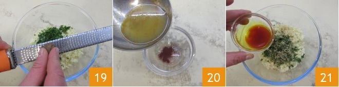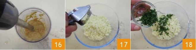 Adjust the salt and pepper and let it cook for 3-4 minutes. Turn off the heat and transfer the vegetables to a tall-sided bowl, blending with an immersion blender until a creamy and homogeneous mixture is obtained 16. Set the mixture aside. Now take another bowl and add the bread crumbs, chop it and add the crushed garlic 17, the finely chopped parsley 18