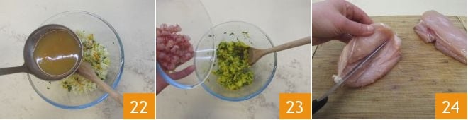add another 30 grams of broth 22; adjust the salt and pepper. Then add the remaining raw shrimp cut into small pieces 23 and mix well: this mixture will be the filling for your chicken pockets. Now proceed with the preparation of the chicken breasts: cut the chicken breast along the natural horizontal line running through the center without cutting it completely, thus obtaining a pocket 24.