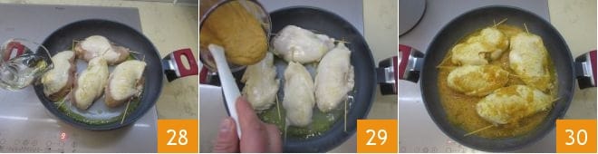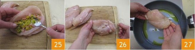 Fill the breasts with the filling you have obtained without blending 25 and seal your pockets with long toothpicks so that the internal mixture does not spill out 26. Then take a pan and pour in some oil. Place the chicken pockets in it and let them brown on both sides 27.