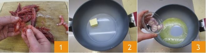 To prepare the chicken pockets stuffed with shrimp, first begin with the preparation of the shrimp broth. Take the shrimp and wash them under abundant water, remove their shells, tails, legs, and heads 1. Then, proceed to remove their intestines using a toothpick (you can consult the cooking school: How to clean shrimp). Place the cleaned shrimp in a bowl covered with plastic wrap in the refrigerator and keep the shells. Then, take the shallot, clean it, and slice it thinly. In a saucepan, melt the butter 2, then add the shallot 3
