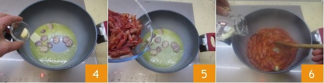 and the garlic clove 4. Sauté for 1 minute, stirring occasionally, then add the shrimp heads and shells 5. Deglaze with the white wine 6 and let it evaporate, cooking over low heat.