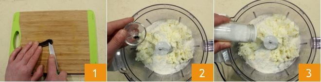 To prepare the Olympic rings cookies, start with the Shortcrust pastry: cut half a vanilla bean and extract the seeds with the blade of a small knife 1. Place the sifted flour, cold butter, vanilla bean seeds 2, and a pinch of salt 3 in the mixer.