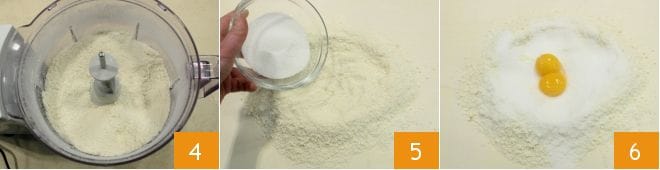 Then blend everything 4 and pour the resulting mixture onto a work surface, forming the classic fountain shape. Pour the sugar in the center 5 along with the 2 egg yolks 6.