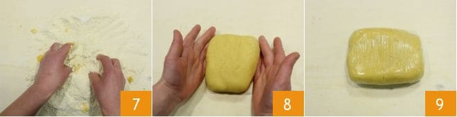 Briefly knead the shortcrust pastry 7 and shape it into a dough ball 8 that you can wrap in plastic wrap 9 and place in the refrigerator to firm up for at least 30 minutes.