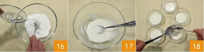 Meanwhile, prepare the water icing: pour the powdered sugar into a small bowl and gradually add the hot water 16, mixing with a teaspoon to obtain a fluid mixture 17. Divide it into five small bowls 18, as many as the colors of the Olympic rings.