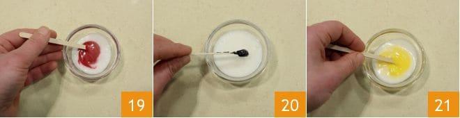 Color each bowl by adding the necessary amount of liquid food coloring: red 19, black 20, green, blue, yellow 21.