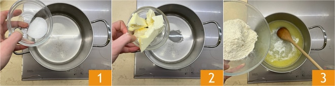To make the éclairs, start with the choux pastry: put water, sugar 1, salt, and butter 2 in a saucepan. Bring to a boil, at which point add the flour all at once, stirring quickly with a wooden spoon 3.