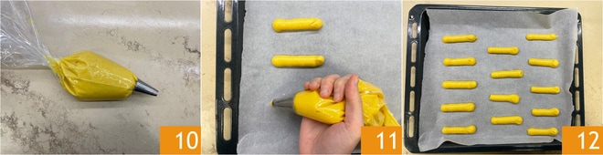 Place it in a piping bag with an 18 mm plain nozzle 10. Pipe onto a baking sheet with parchment paper, creating strips about 4-5 inches long 11. Space them apart so they have room to expand during baking 12. You should get about 2 sheets: it's recommended to bake them one at a time.