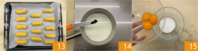 Bake in a preheated static oven at 365°F for about 30 minutes. They should be light and crispy when done 13. Remove from the oven and let cool. Meanwhile, prepare the custard: heat the milk with the vanilla seeds in a saucepan 14, while in a bowl, mix sugar and egg yolks 15.