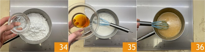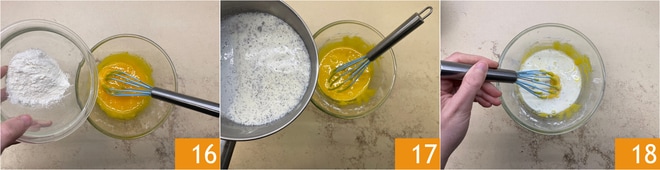 Mix, then add the flour 16. Gradually pour the warmed milk into the egg mixture 17, continuing to stir 18.