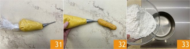 Place the cream in a piping bag with a syringe nozzle 31 to fill the éclairs 32. Only at this point prepare the glaze, so it doesn't cool down and is easier to use. Pour the powdered sugar into a saucepan 33.