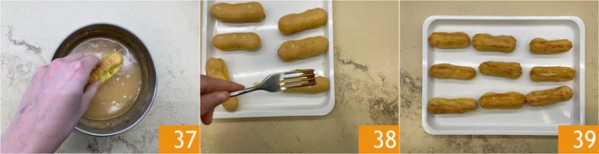 Once ready, keep the flame low and glaze your éclairs by dipping the tops 37, place them on a tray, and let the glaze set. Once cool, decorate them with the remaining 1 oz of caramel, using a fork to create lines on the glaze 38. If the caramel has solidified too much, you can warm it for a few seconds in the microwave before using it for decoration. The éclairs are ready to be served 39!