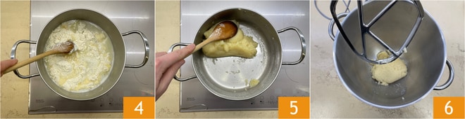Continue cooking, stirring 4, until a white film forms on the bottom of the pot and the mixture pulls away uniformly from the sides 5. Remove from the heat and transfer the mixture to a stand mixer with a paddle attachment 6, then let it run for a minute to cool it down slightly.