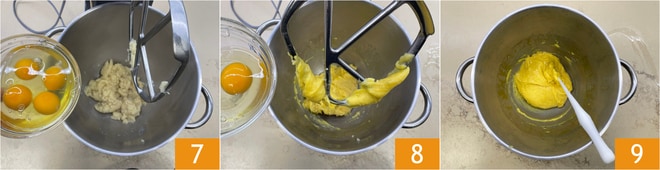 Add the eggs one at a time 7, ensuring each one is well incorporated before adding the next 8. You'll know the mixture is ready when lifting the paddle forms a sort of triangle as it falls. The choux pastry is ready 9.