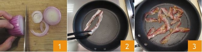 To make the egg burger, first clean and slice the onion 1. In a hot pan, place the bacon slices 2 and cook them over medium-low heat for 4-5 minutes. When they are nice and crispy and golden 3