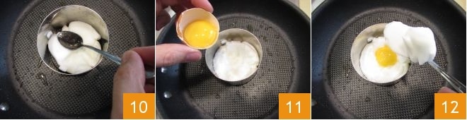Pour a tablespoon of the beaten egg white inside 10, then a yolk 11, and cover with another tablespoon of egg white 12.