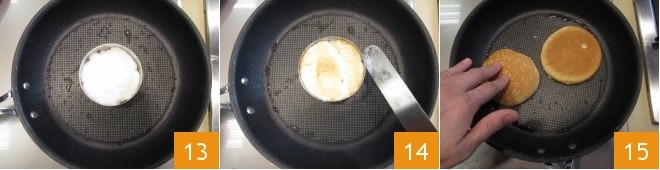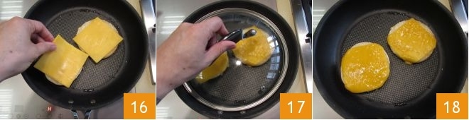 then turn it over, place the slices of cheddar 16, cover with the lid 17, and heat until the cheese has melted 18.