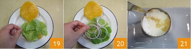 Now remove from the heat and fill the base of the bun with the crunchiest lettuce leaves 19, previously washed and dried, and a few rings of onion 20. Now remove the egg from the mold, using a sharp knife along the edge to facilitate the operation 21.