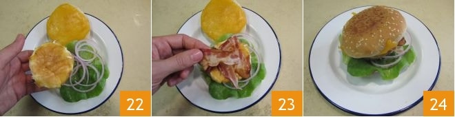 Also place the egg in the bun 22 and the bacon 23. Close with the other half of the bun and serve your egg burger immediately 24!