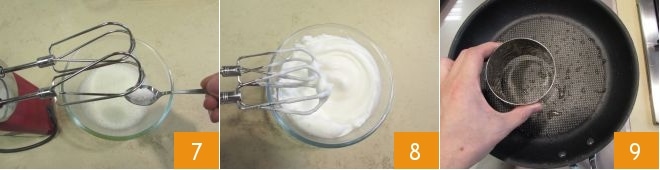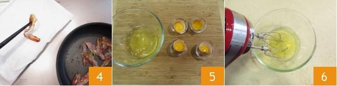 remove them from the pan and let them dry on paper towels 4. Separate the egg whites from the yolks (the recipe requires 4 yolks and 5 egg whites; the leftover yolk can be used as indicated at the end of the recipe), being careful to keep each yolk separate in its own small bowl 5. Beat the 5 egg whites with an electric mixer 6