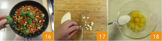 and the caciocavallo 19. Whisk everything together 20 and pour into the pan 21.