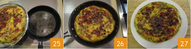 and using the lid, or a larger plate, flip the frittata 25. Continue cooking for another 2 minutes 26 and serve your frittata with eggplants and cherry tomatoes 27.