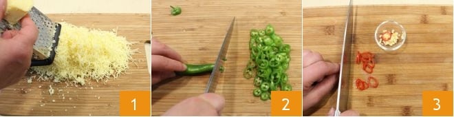 To make the enchiladas, start by grating the cheddar cheese 1, then thinly slice the green chilies 2, remove the seeds from the red chili, and also slice it thinly 3.