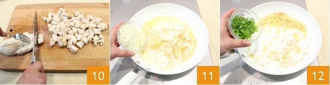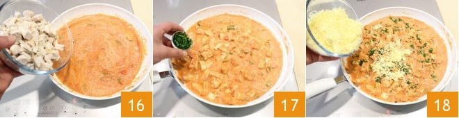 stir with a spoon and then add the chicken cubes 16, the chopped parsley 17, and the grated cheddar cheese, making sure to set aside a couple of tablespoons for garnish 18.