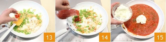 and the red chili 13 and 17.6 oz of tomato puree 14, salt, pepper and cook for 15 minutes over low heat. Add 4.5 oz of sour cream 15,