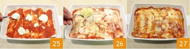 roll the tortillas 22 and lay them in the baking dish 23 with the folded side down. Cover the surface with the tomato sauce 24,