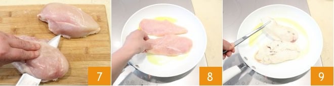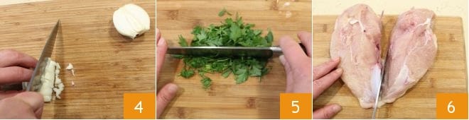 Peel and finely chop the onion 4 and finally chop the parsley 5. Cut the chicken breast in half 6