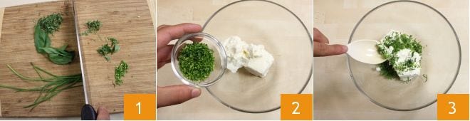 To prepare the speck bundles stuffed with robiola with torcelli, start by making the robiola cream: finely chop the herbs (thyme, basil, and chives) 1, then add them to the robiola 2, which you have previously placed in a large bowl. Mix to combine all the ingredients 3