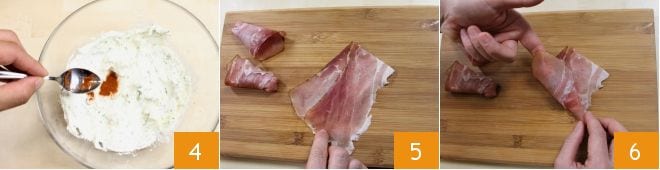 and add a tablespoon of sweet paprika to the mixture 4. Once the cream is ready, transfer it to a piping bag with a star tip and set it aside. Now take the speck slices and fold them over themselves to form cones, holding the bottom end of the slice with a finger to facilitate the operation (5-6) (make sure to keep the peppered side facing outwards).