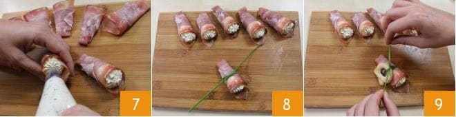 Fill each cone with the previously prepared robiola cream 7, and secure it by tying each cone with a chive strand 8, to which you will also tie a torcello 9. The speck bundles stuffed with robiola with torcelli are ready: enjoy your meal!
