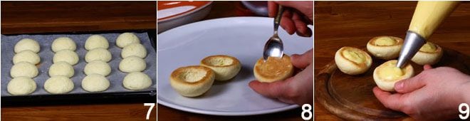 Bake the obtained balls in a preheated oven at 355°F for about 15-20 minutes. The dough, which should not color while baking, 7 will create about 30 hemispheres. Meanwhile, prepare the custard (see recipe by clicking Pastry cream) and let it cool. When the hemispheres are cooked, remove them from the oven and let them cool, then take a teaspoon and slightly hollow out the center of the flat side of each piece 8 to obtain a small cavity. Put the custard into a pastry bag with a smooth nozzle and squeeze it into the small cavity in the center of each hemisphere 9;