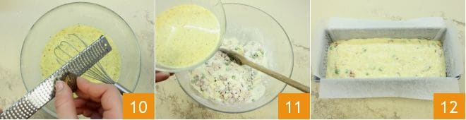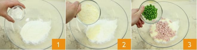 To prepare the fake sweet plumcake, start by sifting the flour into a bowl, then add the baking powder for savory preparations 1. Then add the grated cheeses 2, peas, and diced cooked ham 3.