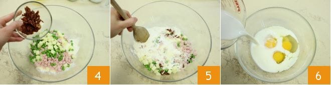 Add the cubed caciocavallo, then drain and pat dry the sun-dried tomatoes on kitchen paper to remove excess oil; then cut them into pieces and add them to the other ingredients 4. Stir the mixture with a wooden spoon 5 and set it aside. In the meantime, in another small bowl, pour the eggs, add the milk and cream 6.