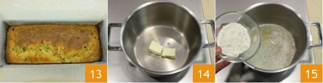 Once cooked, take it out of the oven 13 and allow it to cool before removing from the mold. While the plumcake is baking, prepare the Parmigiano Cream: in a saucepan, add the butter 14 and melt it over low heat. Then add the sifted flour in a steady stream 15.
