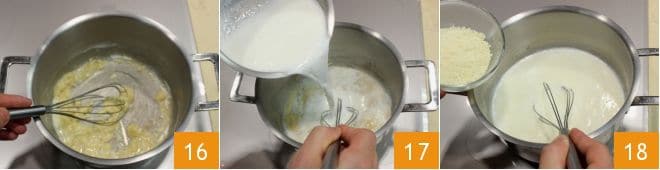 and stir with a whisk and let the flour turn golden to obtain a roux 16. At this point, add the grated nutmeg and the previously heated milk in a thin stream, continuing to mix with the whisk 17, then also add the grated Parmesan 18.